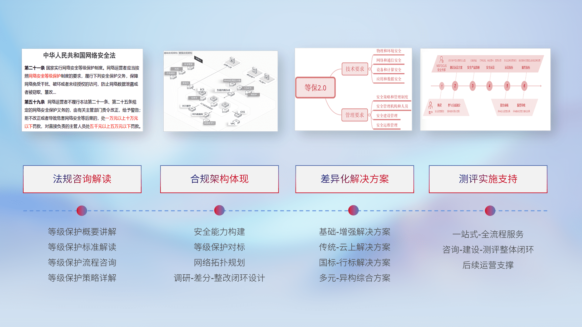 通过专业的法律咨询解读、、、、合规架构体现、、、差异化解决方案、、、、测试实施支持等服务,,为客户量身打造等保合规体系。。。。