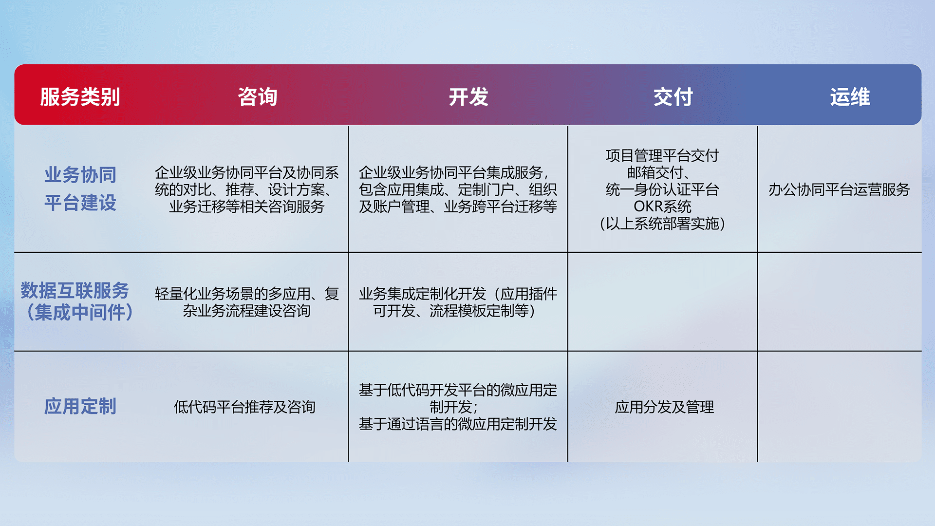 针对钉钉、、企微、、IDaas等平台级产品提供产品的规划、、、方案、、、交付、、、、定制化开发等服务,,,实现如统一协同办公、、、、智能客户服务、、、混合会议管理、、智能数据查询、、、等业务场景,,,实现数字化转型。。
